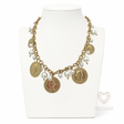 La collana Regina d’Oro è un gioiello dal fascino unico che unisce l’eleganza delle perle con la forza dei charms a moneta. Realizzata in acciaio dorato, presenta una catena bold arricchita da dettagli preziosi che richiamano il lusso e la regalità.